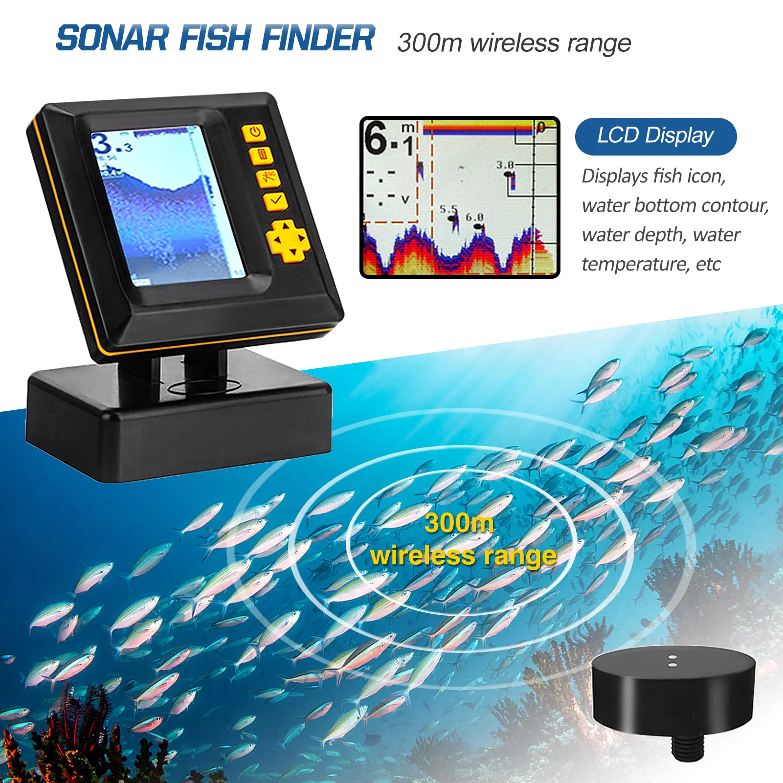 Sonar fish finder with up to 300 meters of wireless range; LCD screen displays fish icons, water bottom, water depth, water temperature, etc.