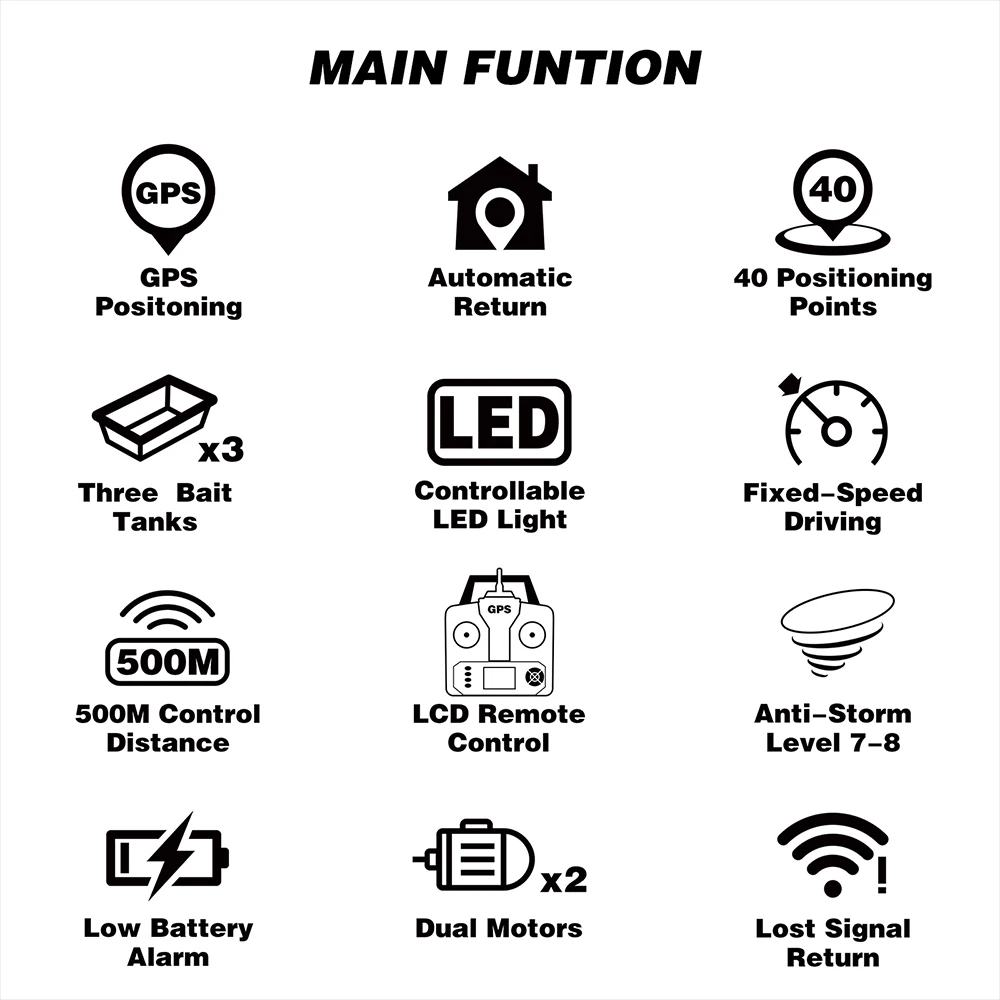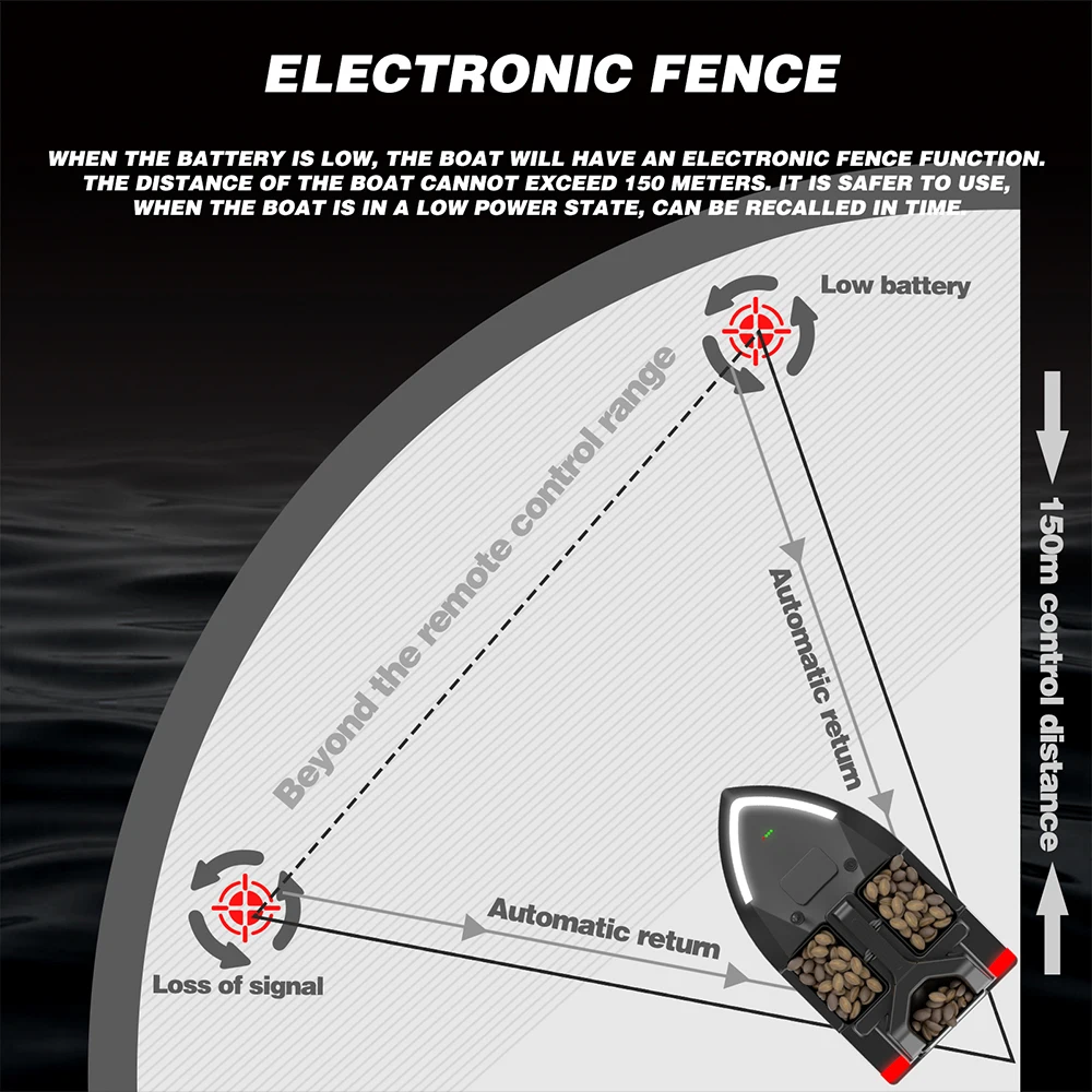 Auto Return: The remote control distance is within 500 meters. When the boat is in low battery, loses signal or exceeds 500 meters, it will return automatically. Don’t be afraid of lose.